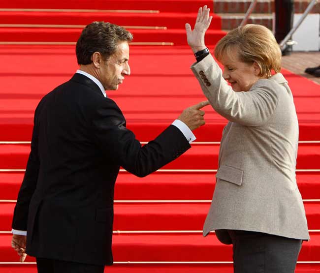 آنگلا مرکل صدر اعظم آلمان در حال دیدار با نیکو سارکوزی رییس جمهوری فرانسه در دیوویل فرانسه