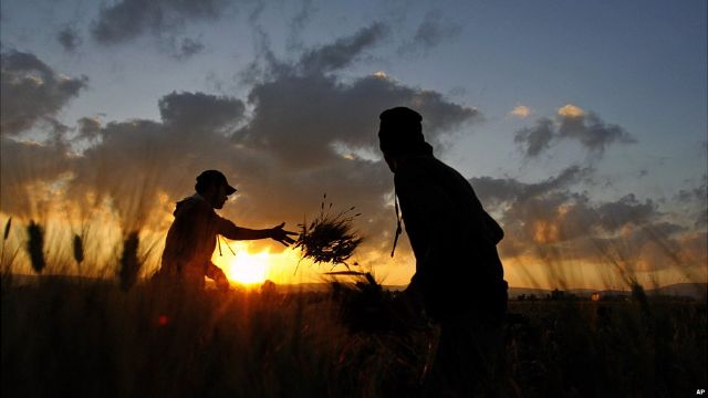 كار كشاورزان فلسطيني در يك مزرعه گندم در حومه شهر جنين در كرانه غربي