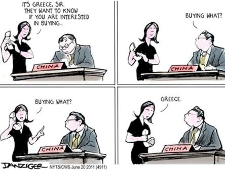 کاریکاتوریست مجله فرانسوی کوریه معتقد است، چندان دور از ذهن نیست که با رشد بالای اقتصادی چین و سقوط اقتصادی یونان به دلیل کسر بودجه و بدهی بالا، چینی ها به خرید یونان اقدام کنند.