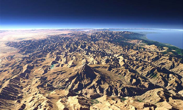 در این تصویر کوه زاگرس را می بینید که تا چند صد کیلومتر از خلیج فارس گسترش یافته است. شهر شیراز و ویرانه های باستانی تخت جمشید در سمت راست در کنار دریاچه نمک مهارلو واقع شده است.