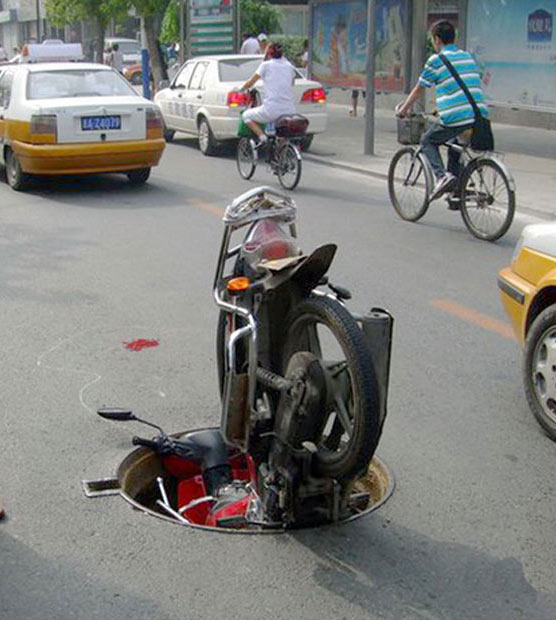 عزیزم اگه یه کم توجه میکردی متوجه میشدی تفاوت ما با چین مثل شب و روزه ،اون چاله فاضلاب که موتور افتاده توش دقیقا مماس با لبه آسفالته ،در صورتی که در ایران با اندازه یه سرعت گیر بلنده یا اندازه یه چاله پایینه.
