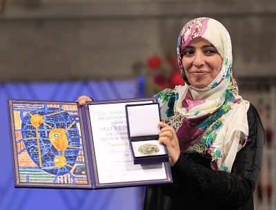 توکل کرمان، نخستین زن عرب برنده این جایزه اعلام کرده است که سهم خود را به «جوانان انقلابی یمن و مردم یمن» میدهد؛ مردمی که برای کسب حداقلهای دموکراسی تلاش کردند.