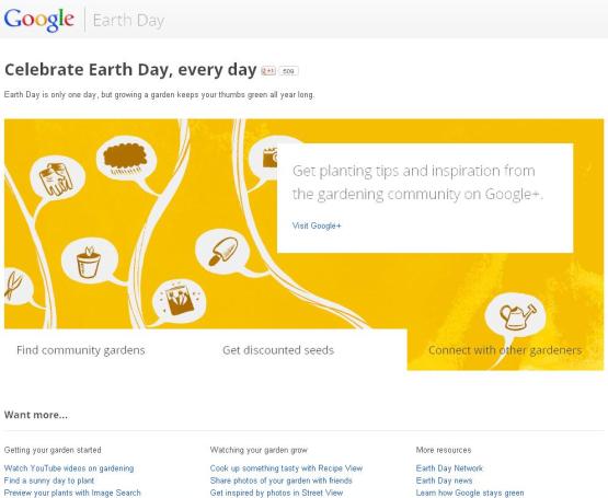 مدیران موتور جستجوی گوگل به مناسبت «روز زمین» دست به ابتکار جالبی زدهاند و به رسم همیشگی لوگویی خاص طراحی کردهاند که در آن با استفاده از بوتههای گیاه اسم این سایت نوشته شده است اما ابتکار جالب گوگل اینجاست که بعد از لحظاتی این بوتهها گل میدهند و زیباییهای محیط زیست سیارهمان را یادآوری میکنند.