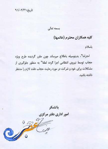 احتراما"، بدينوسيله باطلاع ميرساند چون مقرر گرديده طرح ويژه حجاب توسط نيروي انتظامي اجرا گردد لطفا" به منظور جلوگيري از مشکلات براي خود و شرکت در مورد رعايت حجاب دقت لازم را مدنظر داشته باشيد.