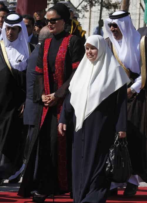 "آمال" همسر اسماعیل هنیه نخست وزیر کابینه حماس در غزه (راست) در کنار "شیخه موزه" همسر امیر قطر