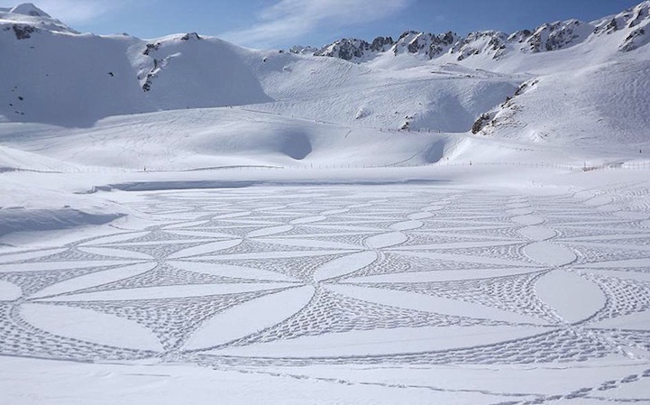 این نقاش کفش های مخصوص برف را به پا می کند و سپس به محلی که قصد کشیدن نقاشی دارد می رود و درآنجا با راه رفتن روی برف نقاشی های بسیار یزرگ را به یادگار می گذارد.