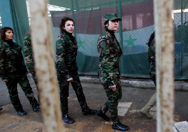 "عبیر رمضان" یکی از زنان داوطلب در این پادگان است که در سن چهل سالگی به نیروهای نظامی سوریه پیوسته است تا در جنگ علیه مخالفین اسد در کنار بشار بایستند؛ او در حالی که لباس نظامی به تن دارد در این پادگان در مرکز حمص همچنان که شعار "خدا، سوریه، بشار، همین و بس" را سر میدهد، رژه میرود.