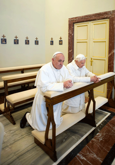 عصر ایران - پاپ فرانسیس رهبر جدید کاتولیک های جهان روز گذشته با حضور در مقر پاپ مستعفی (بندیکت شانزدهم) در قصر " گاندولفو" با او دیدار،گفتگو و عبادت کرد.