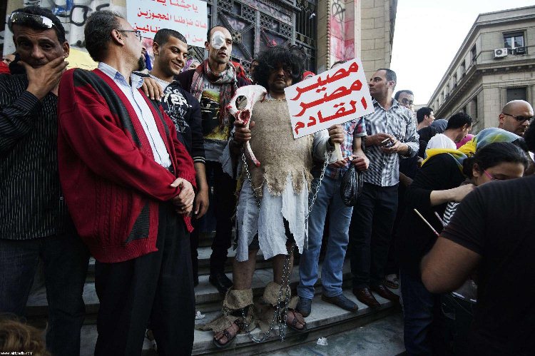عصر ایران - در تظاهرات روز گذشته اعضا و هواداران جنبش لیبرالی 6 آوریل یکی از گروه های مخالف محمد مرسی رئیس جمهور مصر، یکی از حاضران با پوشیدن لباس افراد غارنشین تابلویی در دست داشت که روی آن نوشته شده بود : "سرنوشت آینده مصر" (منبع: روزنامه سعودی الریاض)