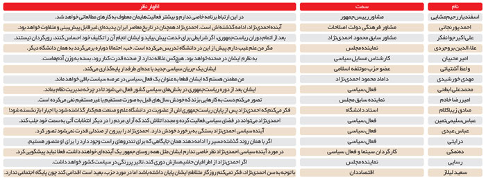 احمدینژاد پس از پایان دوره ریاستجمهوریاش چه خواهد کرد؟ به دانشگاه بازمیگردد؟ حزب تاسیس میکند؟ در عرصه سیاسی خواهد ماند یا برای همیشه این عرصه را ترک خواهد کرد؟ مشایی چه میکند؟ مرد حاشیهساز دولت که احمدینژاد در مورد او میگوید «مشایی یعنی احمدینژاد، احمدینژاد یعنی مشایی» اینها پرسشهایی است که درباره آینده سیاسی احمدینژاد مطرح میشوند. این روزها آینده سیاسی احمدینژاد و چینش کابینه روحانی نقل محافل مختلف سیاسی و خبری است.