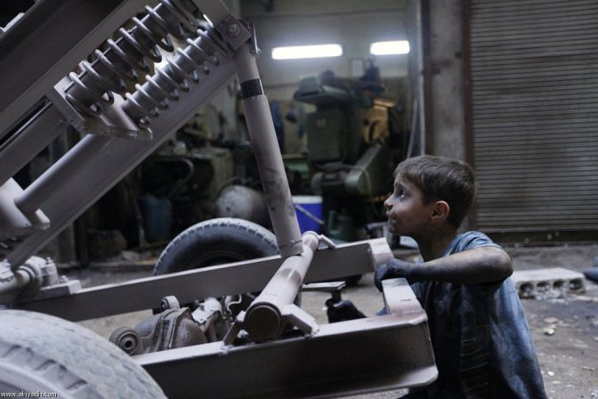 "عیسی" کودک 10 ساله در سوریه به همراه پدرش در کارگاه تعمیر تسلیحات مخالفان مسلح بشار اسد رئیس جمهور سوریه فعالیت می کند.