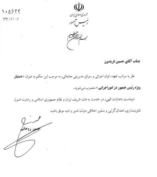 انتخاب - تصویر زیر، حکم حسن روحانی برای برادرش حسین فریدون را نشان میدهد.