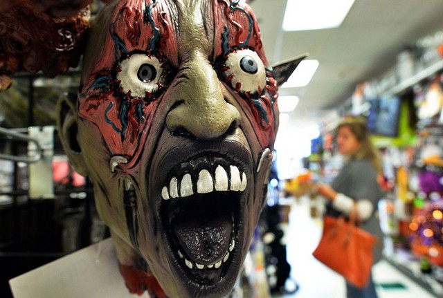 یک زن آمریکایی در مریلند برای جشن هالوین در حال خرید از فروشگاه فروش لوازم جشن های هالوین است
