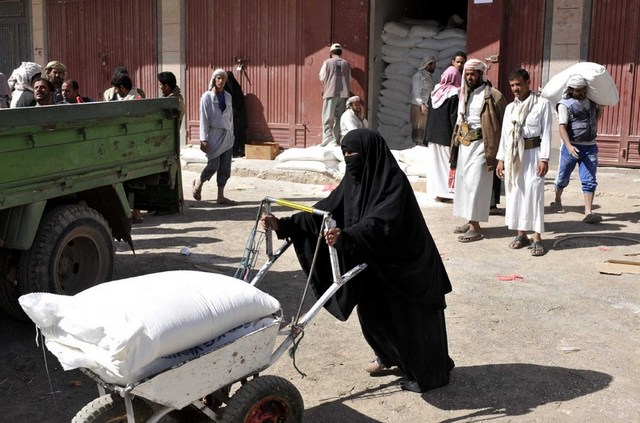 یک زن یمنی در حال حمل کمک های غذایی (آرد) ارسالی از آمریکا به خانه اش (شهر صنعا)