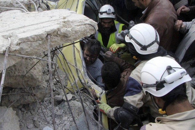 تلاش برای نجات زیر آوار ماندگان ساختمانی که در جریان حمله هوایی به حلب ویران شده است