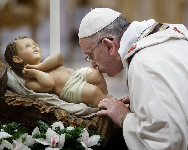 بوسه پاپ بر مجسمه عیسای نوزاد در مراسم کریسمس در کلیسای واتیکان