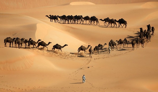 راهپیمایی شترها در صحرای لیوا در 220 کیلومتری شهر ابوظبی امارات