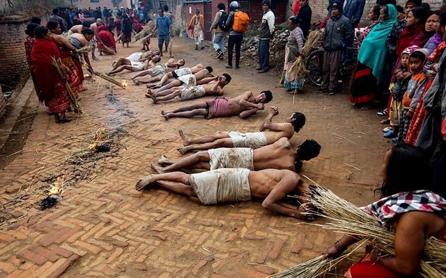 فرو بردن میله بر لب و راه رفتن روی میله های فولادی نوک تیز در جریان فستیوال سنتی تاتونگ در اندونزی