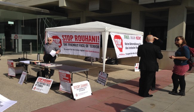 این تصویر، چند صهیونیست را نشان میدهد که مقابل چادری ایستادهاند که بر روی آن پلاکاردهایی با مضمون "روحانی؛ چهره دوستانه تروریسم" و "روحانی را متوقف کنید" و "ظریف را متوقف کنید" مشاهده میشود.