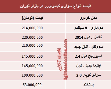 قیمت روز برخی از مدل های سواری کیاموتورز در بازار تهران به شرح زیر است؛