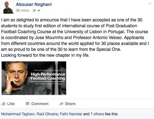 نوغانی این خبر را روی صفحه شخصی اش در یکی از شبکه های اجتماعی نوشت تا به این ترتیب از یک موفقیت دیگر در اروپا خبر بدهد.او به عنوان اولین ایرانی بر سر کلاس های مربیگری ژوزه مورینیو خواهد نشست تا کورس مذکور را در رشته فوق لیسانس مربیگری پشت سر بگذارد. نکته جالب این که برای حضور در این کلاس ها تنها 30 مربی از سراسر جهان می توانستند مجوز ورود به دانشگاه لیسبون را دریافت کنند که ابوذر نوغانی به عنوان یک ایرانی مجوز را به دست آورد تا یکی از بزرگ ترین موفقیت های خود را جشن بگیرد و نام ایران را بیش از گذشته بر سر زبان ها بیاندازد.