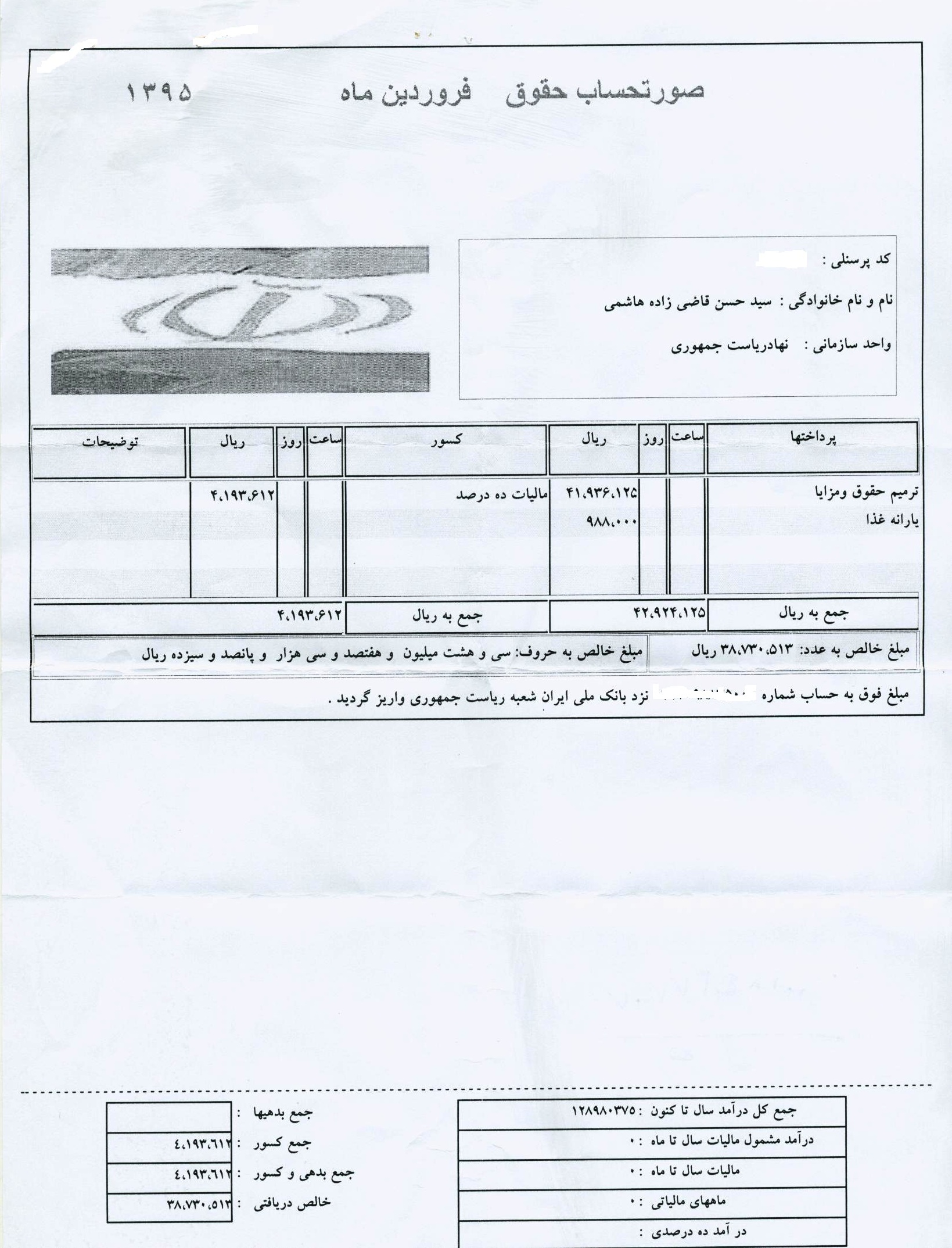 عصرایران - سایت اینترنتی وزارت بهداشت (وب دا) ، فیش حقوقی حسن قاضی زاده هاشمی وزیر بهداشت را منتشر کرد. فیش حقوقی وزیر بهداشت - فروردین 95 فیش حقوقی وزیر بهداشت - خرداد 95
