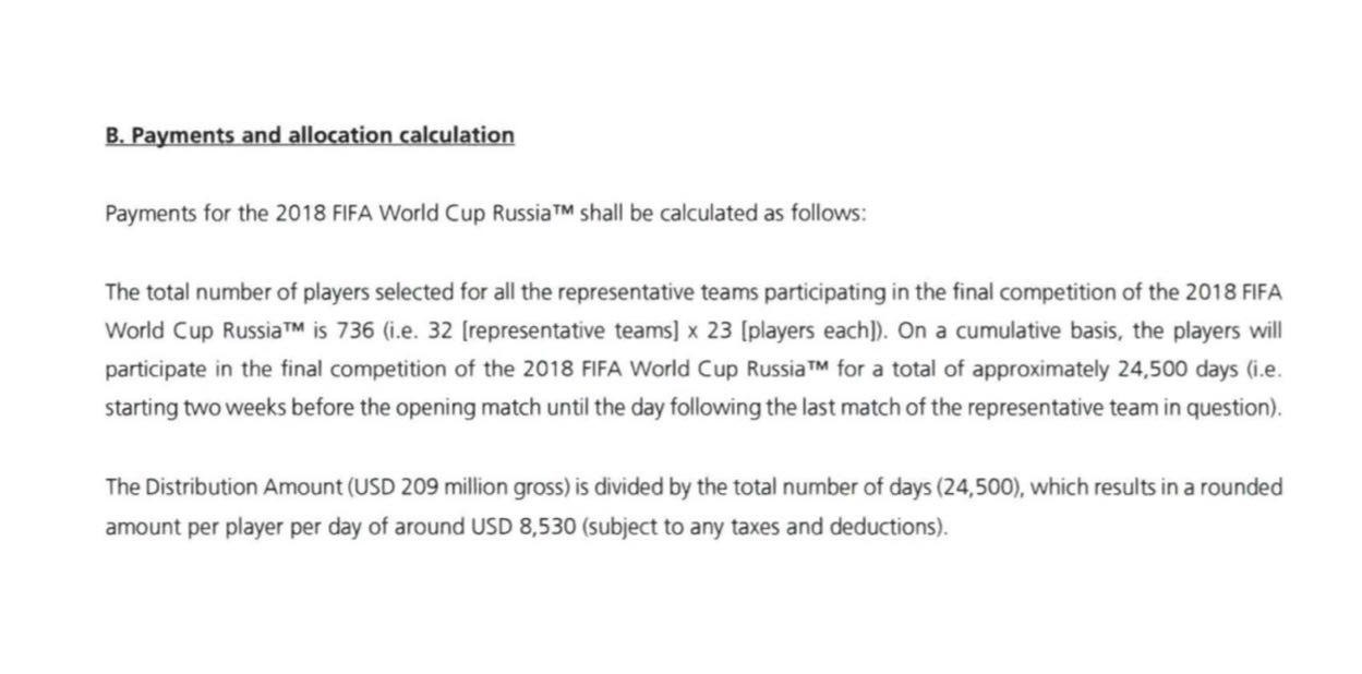 تنها رقمی که در خبر سایت فدراسیون فوتبال ایران درست درج شده، 8530 دلاری است که به ازای هر روز حضور بازیکن در اردو به باشگاهش تعلق می گیرد. اما فدراسیون توضیح نداده که تعداد این روزها از دو هفته قبل از افتتاحیه لغایت یک روز بعد از آخرین بازی هر تیم ملی محاسبه می شود. یعنی 24500 روز برای مجموعه 32 تیم حاضر و حدود 28 روز برای هر تیمی که قادر به صعود از مرحله گروهی نشود.