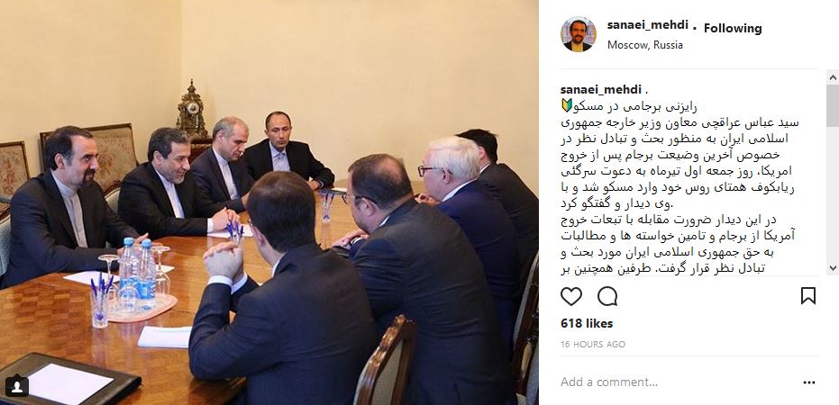 سید عباس عراقچی معاون وزیر خارجه جمهوری اسلامی ایران به منظور بحث و تبادل نظر در خصوص آخرین وضیعت برجام پس از خروج امریکا، روز جمعه اول تیرماه به دعوت سرگئی ریابکوف همتای روس خود وارد مسکو شد و با وی دیدار و گفتگو کرد.
