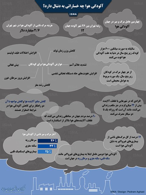 طبق اعلام وزارت بهداشت، آلودگی هوا چهارمین علت مرگ و میر و دومین علت بیماریهایی مانند سکتههای قلبی، مغزی و سرطان ریه در جهان است. شهر تهران نیز در حال حاضر از بین ۲۶ شهر آلوده جهان، در رتبه ۱۲ قرار دارد. افزون بر آن، سالانه هفت میلیون انسان بر اثر آلودگی هوا جان خود را از دست میدهند و به طور کلی از هر ۱۰ مرگی که رخ میدهد، یک مورد مرگ ناشی از آلودگی هواست. بخشی از این آمارها را رئیس گروه سلامت هوا و تغییرات اقلیمی وزارت بهداشت اعلام کرده است.