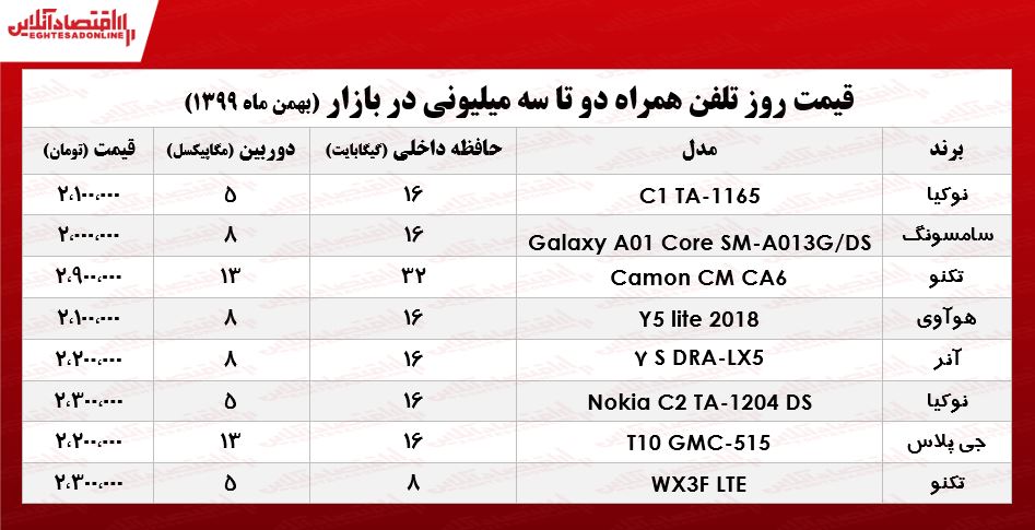 آنچه در زیر می‌آید قیمت انواع موبایل ۲ تا ۳ میلیون تومانی در سطح بازار تهران است.