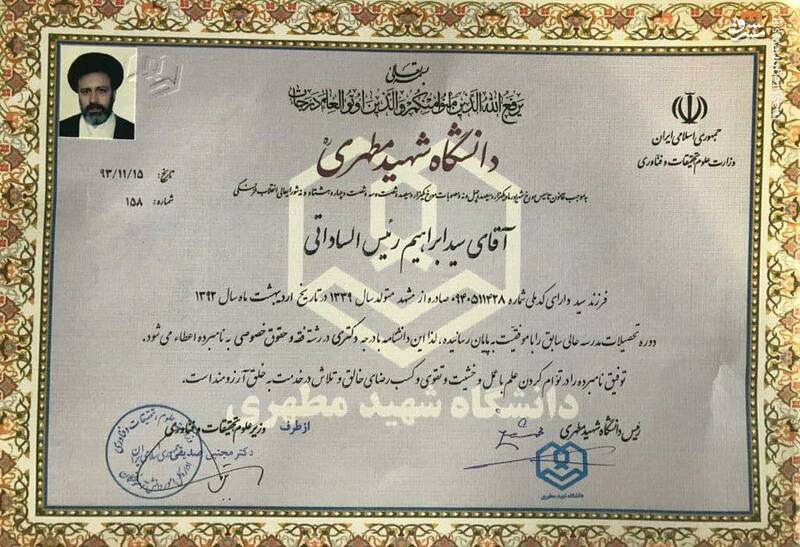از این رو، رئیسی نیز مانند بسیاری از روحانیون کشور از قانون برابرسازی مدارک حوزوی استفاده کرده و توانسته است دکترای حقوق را از دانشگاهی که برای این منظور تاسیس شده (دانشگاه شهید مطهری، معروف به مدرسه عالی شهید مطهری) بگیرد.