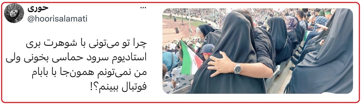 عصر ایران؛ جعفر محمدی - گاهی وقت ها یک جمله، اندازه یک کتاب، حرف مگو دارد؛ درست مانند این توئیت که یکی از دختران سرزمین مان نوشته است: "تو چرا می تونی با شوهرت بری استادیوم سرود حماسی بخوانی ولی من نمی تونم همون جا با بابام فوتبال ببینم؟!"